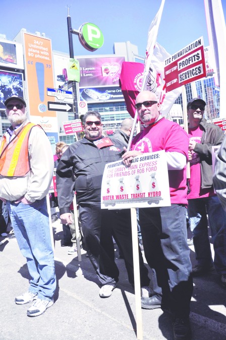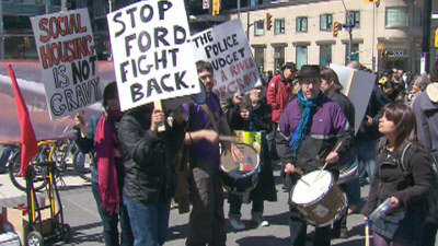 逾5,000多名市民聚集在市中心的登打士广场示威﹐随后又向弥敦菲腊广场进发﹐抗议市府削减公共开支﹐及将多伦多小区房屋公司(TCHC)私有化。
