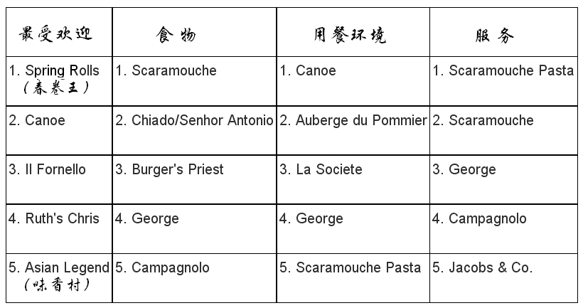 Canoe餐厅无缘口味榜和服务榜前五名,但是靠着极佳的用餐环境,她还夺得了最受欢迎榜中第二的位置。