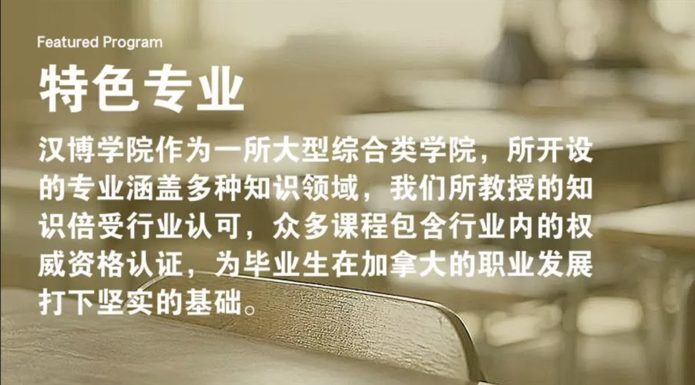 汉博学院共有28个本科,98个学院文凭和证书专业,以及48个研究生证书课程面向国际生开放。其中涵盖商科、酒店旅游管理、艺术设计、健康科学、人文社科、信息技术、传媒、音乐表演以及工程几大领域